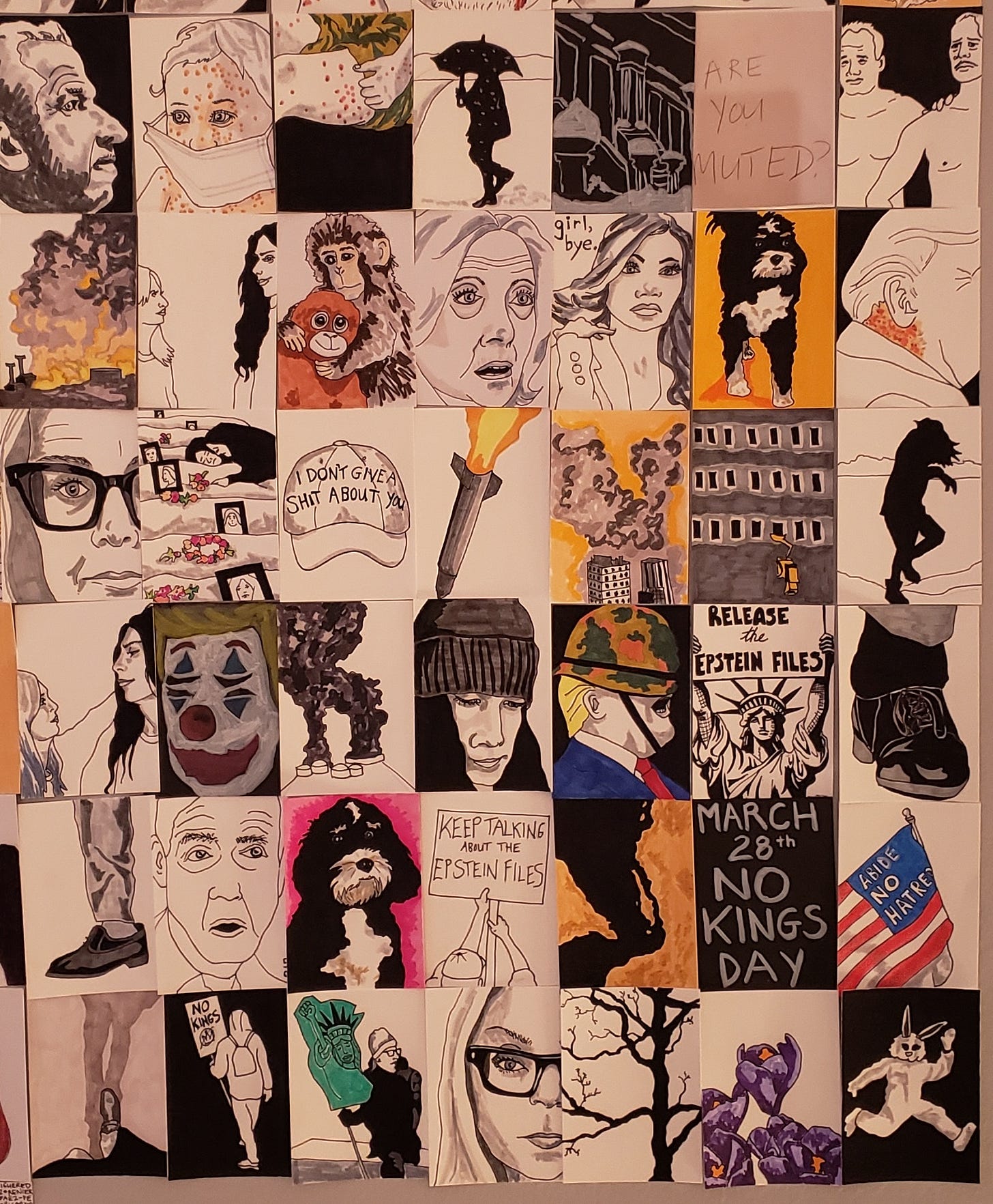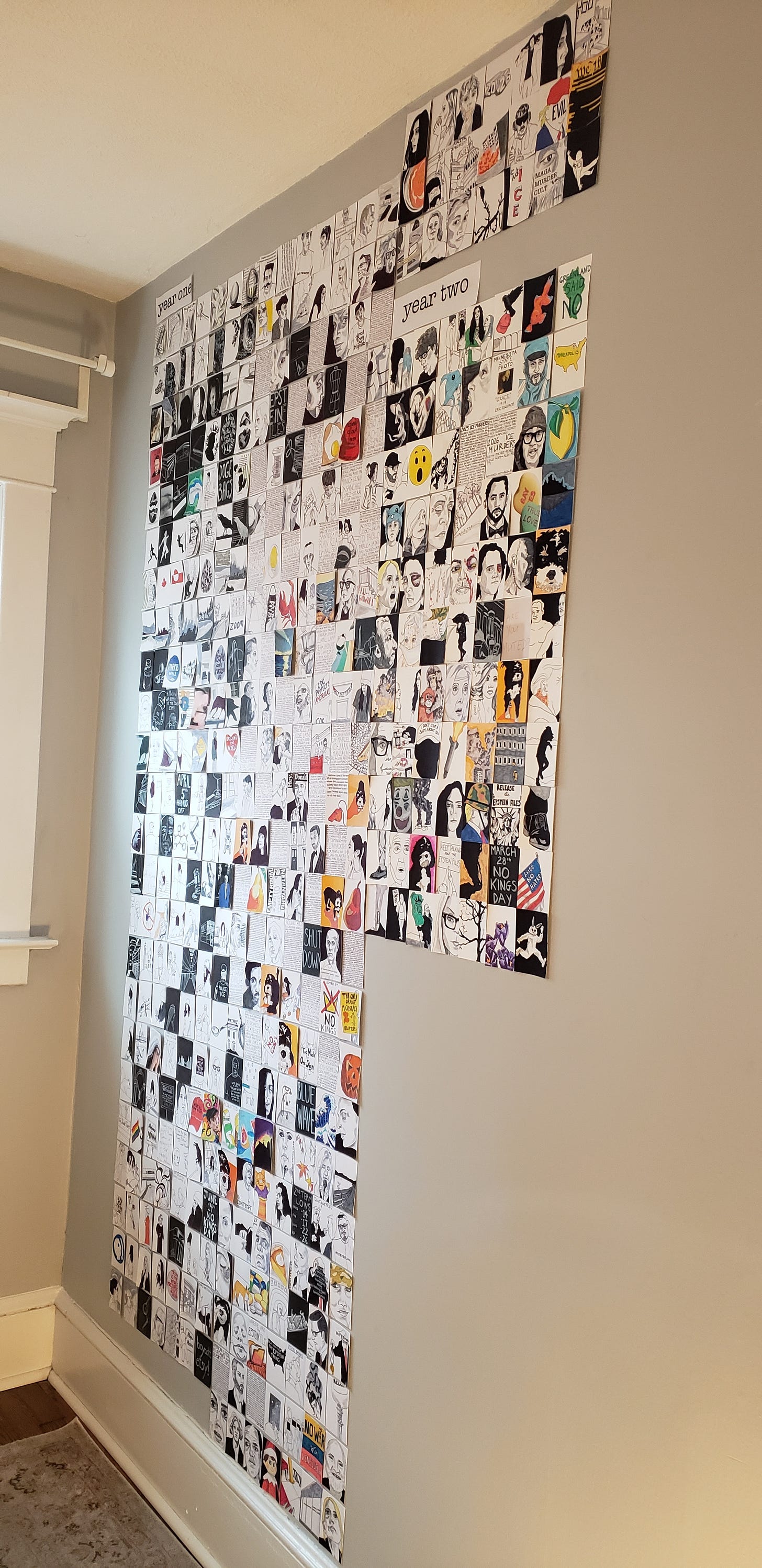 If you are new to my substack, you may not know that I am building a wall in response to this administration, a drawing a day until it ends one way or another. Every few weeks, I post photos as an update, which is what I’m doing today because I am opening for David Sedaris in less than a week and I’m still working on my essay.